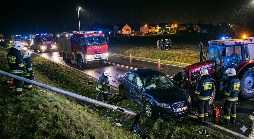 04.03.2026 o godz 18:37 zostaliśmy zadysponowani do wypadku na DK30, gdzie w miejscowości Trójca doszło do zderzenia samochodu osobowego z ciągnikiem. Obraz poglądowy wygenerowany przez AI https://g.co/gemini/share/3ab276bcd4b9